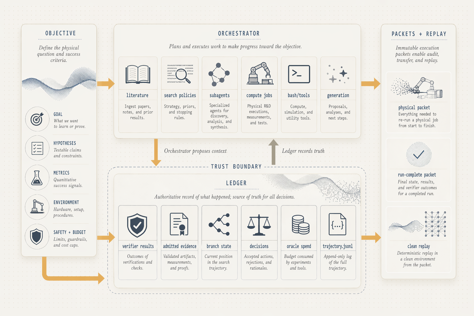 The ledger is the truth side of the system. It records admitted evidence, candidate state, budgeted physical-test spend, explicit decisions, and the packet that moves to physical validation. Its job is to narrow the campaign, decide what is trusted, what is pruned, what is revised, and what advances.