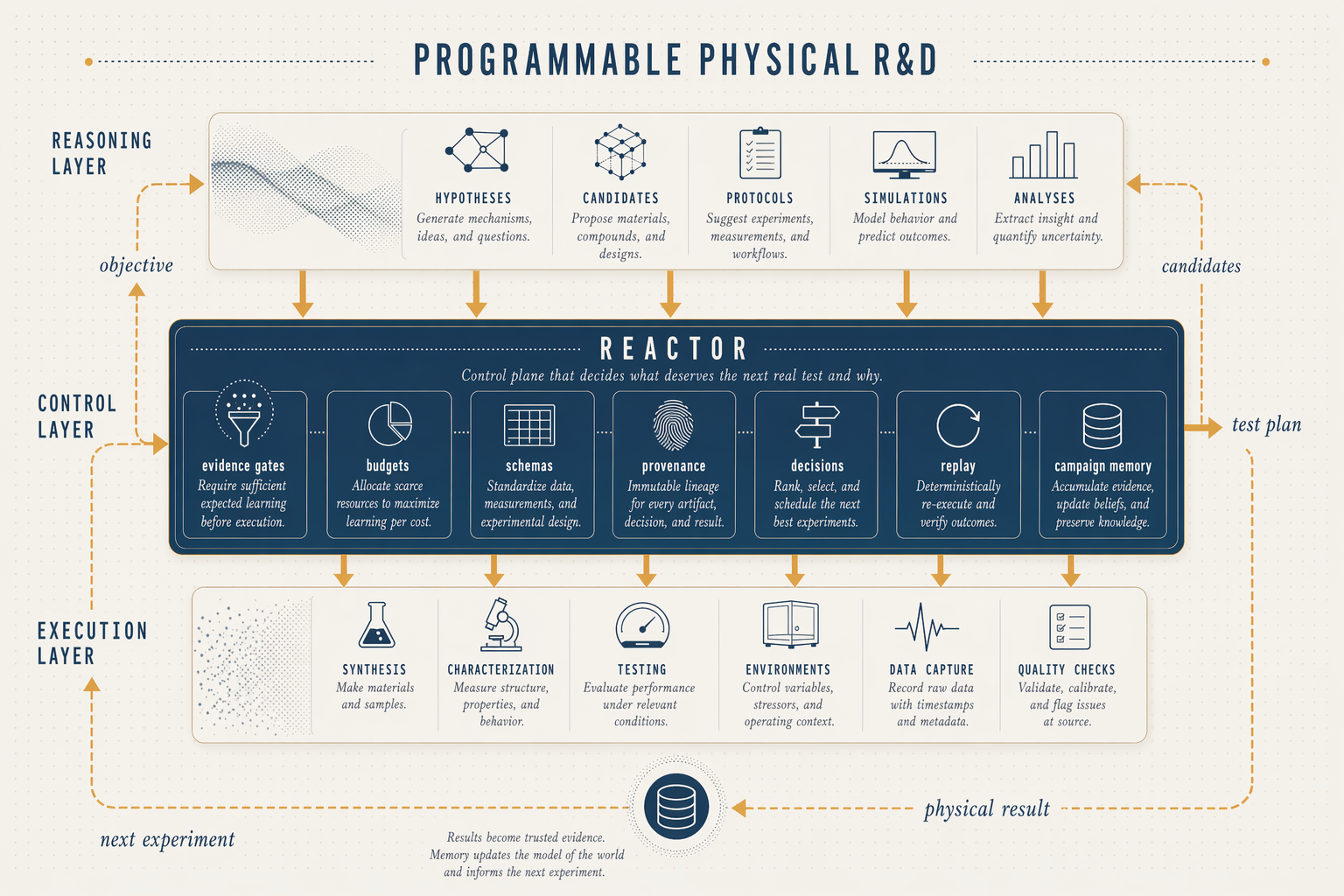 In our earlier work on training scientific judgment, we described this as the planner-verifier boundary. It is the decision layer where an agent must allocate search, trust evidence, escalate verification, and revise belief under budget. Reactor is the product version of that thesis for physical R&D campaigns.